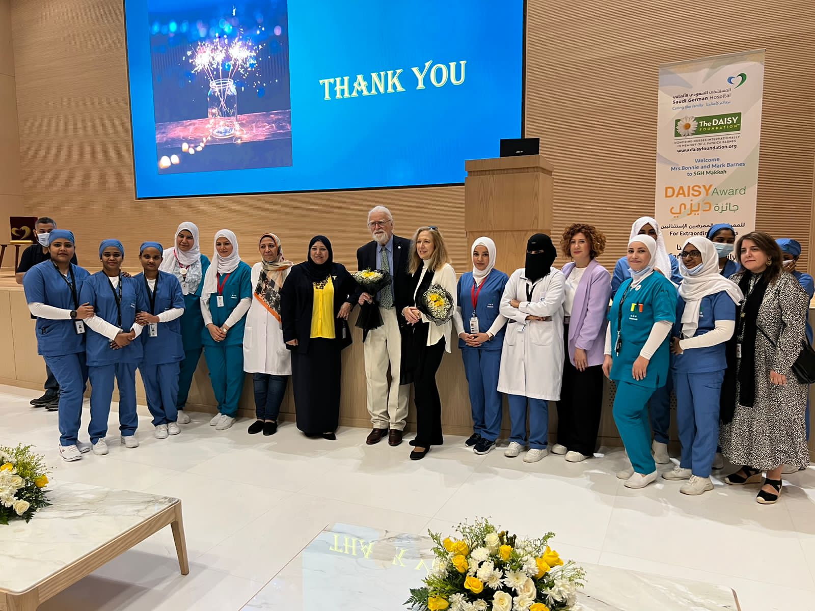 كرمت مؤسسة ديزي الدولية للأمراض التي تهاجم الجهاز المناعي يوم أمس عددا من الممرضين والممرضات من مختلف أقسام المستشفى السعودي الألماني بمكة المكرمة بحضور المدير التنفيذي للمستشفى الدكتور أحمد عيسى والمدير التشغيلي الدكتور شريف حسين وعدد من الكادر التمريضي ورؤساء الاقسام ؛ بعد ترشيحهم لجائزة ديزي للممرضين والممرضات المتميزين ، وفق معايير جائزة المؤسسة للتمييز بين الكادر التمريضي في العمل الإنساني ضمن برنامج دولي يعترف ويحتفي بالرعاية المتميزة والمهارة المهنية والتعاطف الذي يقدمه الكادر التمريضي للمرضى وعائلاتهم من خلال المهارات الإكلينيكية الفريدة والرعاية الحنونة المقدمة يومياً من قبلهم.