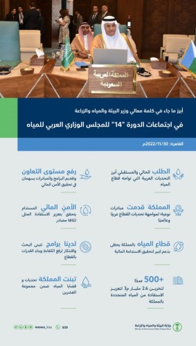 وتطلع معاليه أن تخرج اجتماعات الدورة الرابعة عشر بتوصيات وقرارات تُسهم في تعزيز أوجه التعاون المشترك؛ لتطوير حلول فاعلة ومستدامة لتحقيق الأمن المائي لدول المنطقة، موجها الدعوة للوزراء العرب لحضور اجتماعات الدورة الخامسة عشرة، التي تستعد المملكة لاستضافتها خلال العام المقبل.