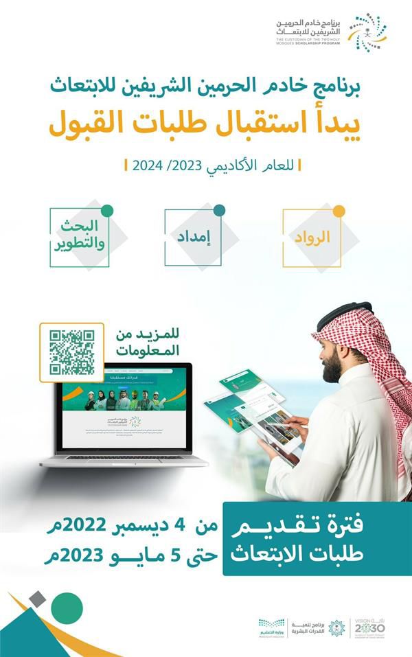 أعلن برنامج خادم الحرمين الشريفين للابتعاث، بدء استقبال طلبات القبول للعام الأكاديمي 2023/2024؛ وذلك بدءاً من اليوم (الأحد) حتى 5 /5/ 2023.