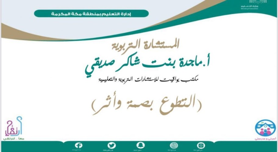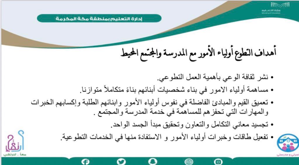 عقدت الإدارة العامة بمنطقة مكة المكرمة ممثلة بوحدة شراكة المدرسة مع الأسرة والمجتمع (ارتقاء ) -بنات – اجتماع اللقاء الافتراضي للأسر (أولياء أمور الطالبات)خلال الفصل الدراسي الثاني للعام الدراسي ١٤٤٤هـ وذلك بعنوان “التطوع ركيزة الحياة ” مساء اليوم من الساعة ٧:٣٠ إلى ٨:٣٠ مساءً ، نفذته مديرة وحدة ارتقاء بدرية الغامدي عبر القاعة الافتراضية.