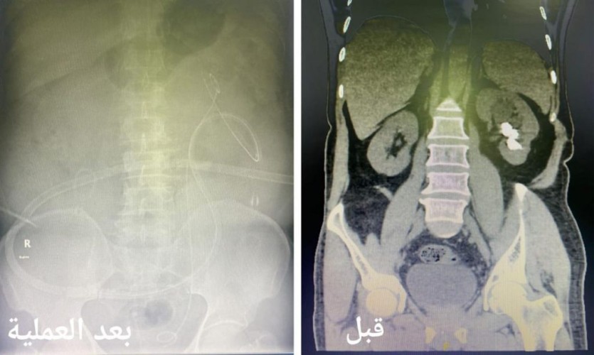 وأضحت أنه تم تجهيز المريض ونقله لغرفة العمليات وعمل تدخل جراحي كلوي دقيق بشق سنتيمتر واحد في الجلد بإستخدام التقنيات الطبية الحديثة لإستئصال الحصوات في جلسة جراحية واحدة و إزالتها بالكامل بواسطة ( المنظار الجلدي الكلوي ) و جهاز التيليسكوب و أدوات طبية صغيرة الحجم حيث تم إغلاق الشق الجراحي بخياطة واحدة دون حدوث أي مضاعفات ولله الحمد