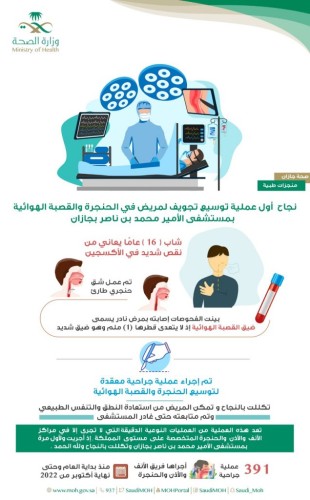 نجح فريق الأنف والأذن والحنجرة بمستشفى الأمير محمد بن ناصر بجازان من إجراء أول عملية توسيع لتجويف الحنجرة والقصبة الهوائية لشاب يبلغ من العمر 16 عاما.