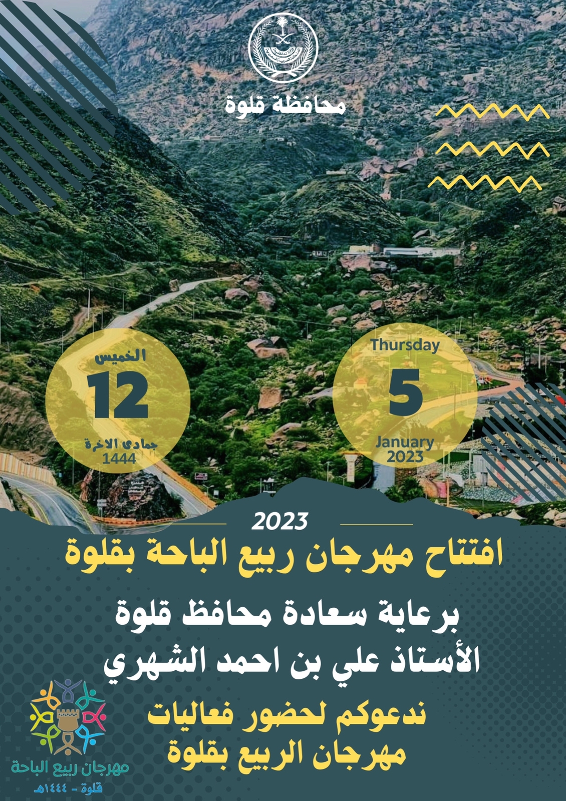 يدشن محافظ قلوه علي الشهري الخميس القادم, مهرجان ربيع الباحة, وذلك بمقر السوق الشعبي بالمحافظة.