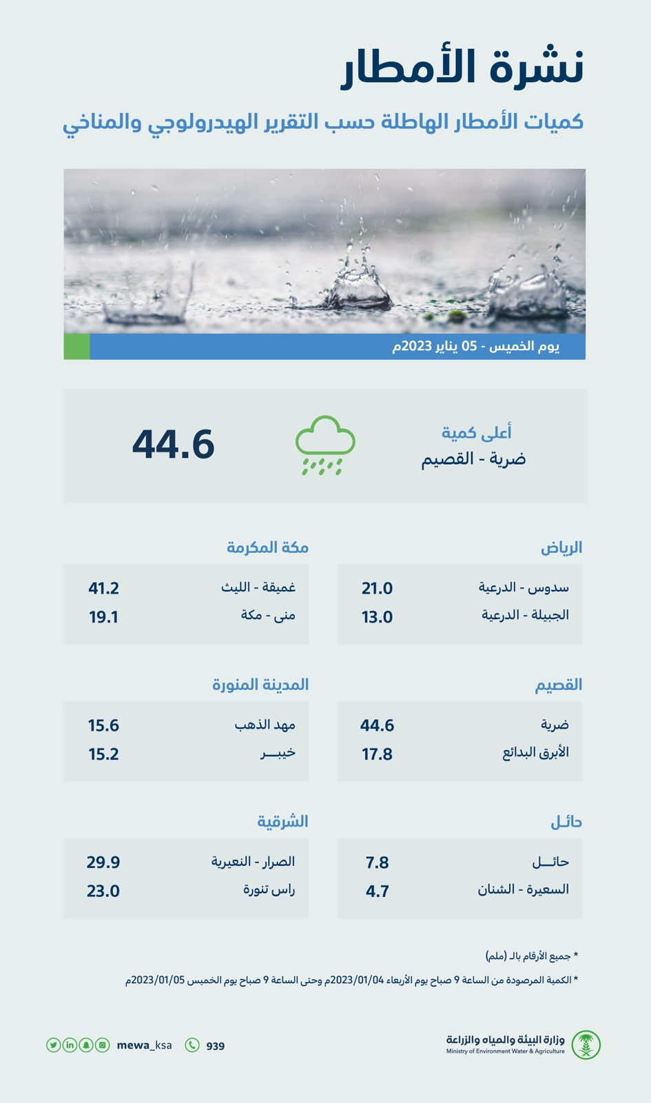 جاء ذلك في تقريرٍ لوزارة البيئة والمياه والزراعة لرصد كميات هطول الأمطار بمناطق المملكة المختلفة؛ حيث سجّلت منطقة مكة المكرمة (41.2) ملم في مركز غميقة بمحافظة الليث، و(19.1) ملم في مِنى، وفي المنطقة الشرقية سجّل مركز الصرار في محافظة النعيرية (29.9) ملم، ومحافظة رأس تنورة (23.0) ملم، بينما سجّلت محافظة الدرعية بمنطقة الرياض (21.0) ملم في مركز سدوس، و (13.0) ملم في الجبيلة، وفي منطقة المدينة المنورة سجّلت محافظة مهد الذهب (15.6) ملم، ومحافظة خيبر (15.2) ملم، بينما سجّلت منطقة حائل (7.8) ملم في مدينة حائل، و(4.7) في قرية السعيرة بمحافظة الشنان.