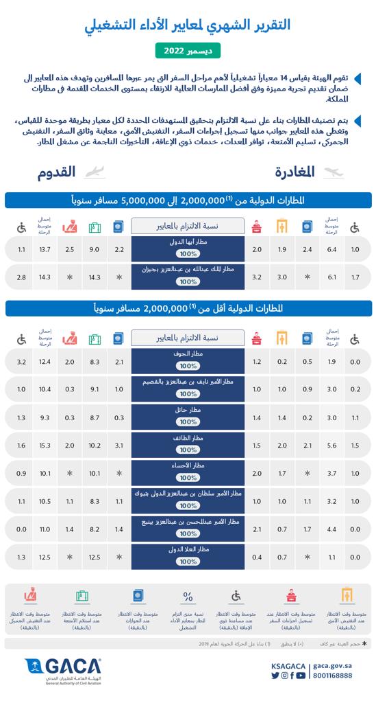 أصدرت الهيئة العامة للطيران المدني اليوم، تقريرها الشهري عن أداء مطارات المملكة الدولية والداخلية، وذلك لشهر ديسمبر 2022م، وفقاً لأربعة عشر معياراً أساسياً لقياس الأداء، وذلك تطبيقاً للتوجُّهات الاستراتيجية التي تستهدف تجويد الخدمات المُقدَّمة للمسافرين، ورفع مستواها، وتحسين تجربة المسافر في مطارات المملكة.
