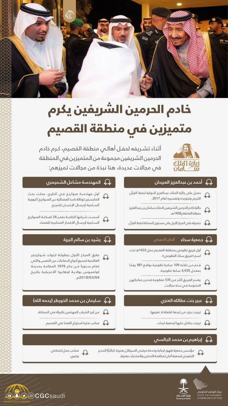 كرم خادم الحرمين الشريفين الملك سلمان بن عبدالعزيز مجموعة من متميزي منطقة القصيم في مستهل زيارته للمنطقة، ونشر حساب مركز التواصل الحكومي على “تويتر” إنفوجرافيك، تضمن نبذات عن مجالات عمل هؤلاء المتميزين، وأبرز الجوائز التي حصلوا عليها.