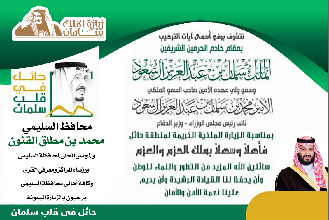 أكد سعادة محافظ محافظة السليمي الأستاذ محمد بن مطلق القنون أن الفرحة في منطقة حائل تغمر القلوب، والمشاعر تفيض بالسعادة، والكل مبتهج وتعلو محيّاهم الفرحة بالزيارة الميمونة لخادم الحرمين الشريفين الملك سلمان بن عبدالعزيز آل سعود – حفظه الله – لتكون بمثابة البشرى التي يتطلّع إليها أهالي المنطقة.