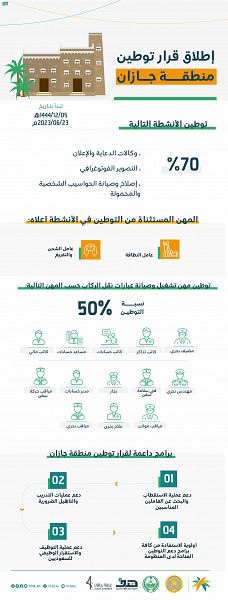 أصدرت وزارة الموارد البشرية والتنمية الاجتماعية، قراراً وزارياً بتوطين عدد من الأنشطة والمهن بنسب مختلفة في منطقة جازان وذلك بالتعاون مع إمارة منطقة جازان، وذلك ضمن برنامج “التوطين المناطقي” الذي تنفذه الوزارة بالشراكة مع وزارة الداخلية وإمارة منطقة جازان لتوفير المزيد من فرص العمل المحفزة والمنتجة لأبناء وبنات الوطن، ورفع نسبة مشاركتهم في سوق العمل.