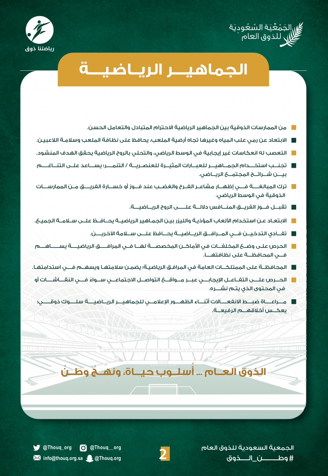وأوضح مدير عام الجمعية عبدالعزيز المحبوب أن الاجتماع الذي عقد مؤخرًا مع المدير التنفيذي لرابطة الدوري السعودي للمحترفين الأستاذ عبدالله الحميدي؛ في سبيل خدمة الأهداف المشتركة التي يسعى لها الطرفين، كتنمية الممارسات السلوكية المعززة للذوق العام، والمساهمة في بناء الشخصية السعودية التي تتبنى قيم الذوق والمواطنة، لنشر رسالة مبادرة “وطن الذوق” وتحقيق أهدافها بصورة عامة، وخاصةً برنامج “رياضتنا ذوق” بالشراكة مع العديد من المؤسسات والأندية الرياضية، والذي يستهدف شريحتين في المجتمع الرياضي، الشريحة الأولى وهي اللاعبين الرياضيين، عبر تعزيز السلوكيات الإيجابية لدى اللاعبين سواءً أثناء الاستعدادات قبل بدء المباراة، أو أثناء إقامتها من خلال تفاعل اللاعبين مع بعضهم بعضًا وضبطهم لانفعالاتهم في مجريات المباراة، أو بعد انتهاءها واحتفاءهم بالفوز أو تقبلهم للخسارة، بالإضافة إلى تعامل اللاعبين أيضًا مع جماهير الأندية الرياضية، وعبر مواقع التواصل الاجتماعي، وأثناء الظهور الإعلامي في مختلف وسائل الإعلام، ومن جانب آخر يستهدف البرنامج شريحة الجماهير الرياضية، بهدف تعزيز الممارسات الحسنة فيما بينهم، والتي تؤكد بدورها الغاية الأساسية من الرياضة بوصفها نشاط ترفيهي قائم على المنافسة الإيجابية التي تحقق المتعة للجميع، ومن تلك الممارسات الذوقية تداول العبارات والهتافات اللائقة ما بين جماهير الأندية، بالإضافة إلى أهمية المحافظة على المرافق الرياضية، حيث أكد الأستاذ عبدالله الحميدي أهمية البرنامج وما يسعى إليه من أهداف حميدة في المجال الرياضي.