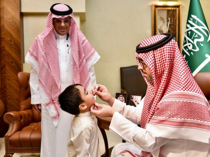 و قام سموه بإعطاء أول جرعة لطفلين إيذاناً بانطلاق الحملة بمحافظة بجدة .
