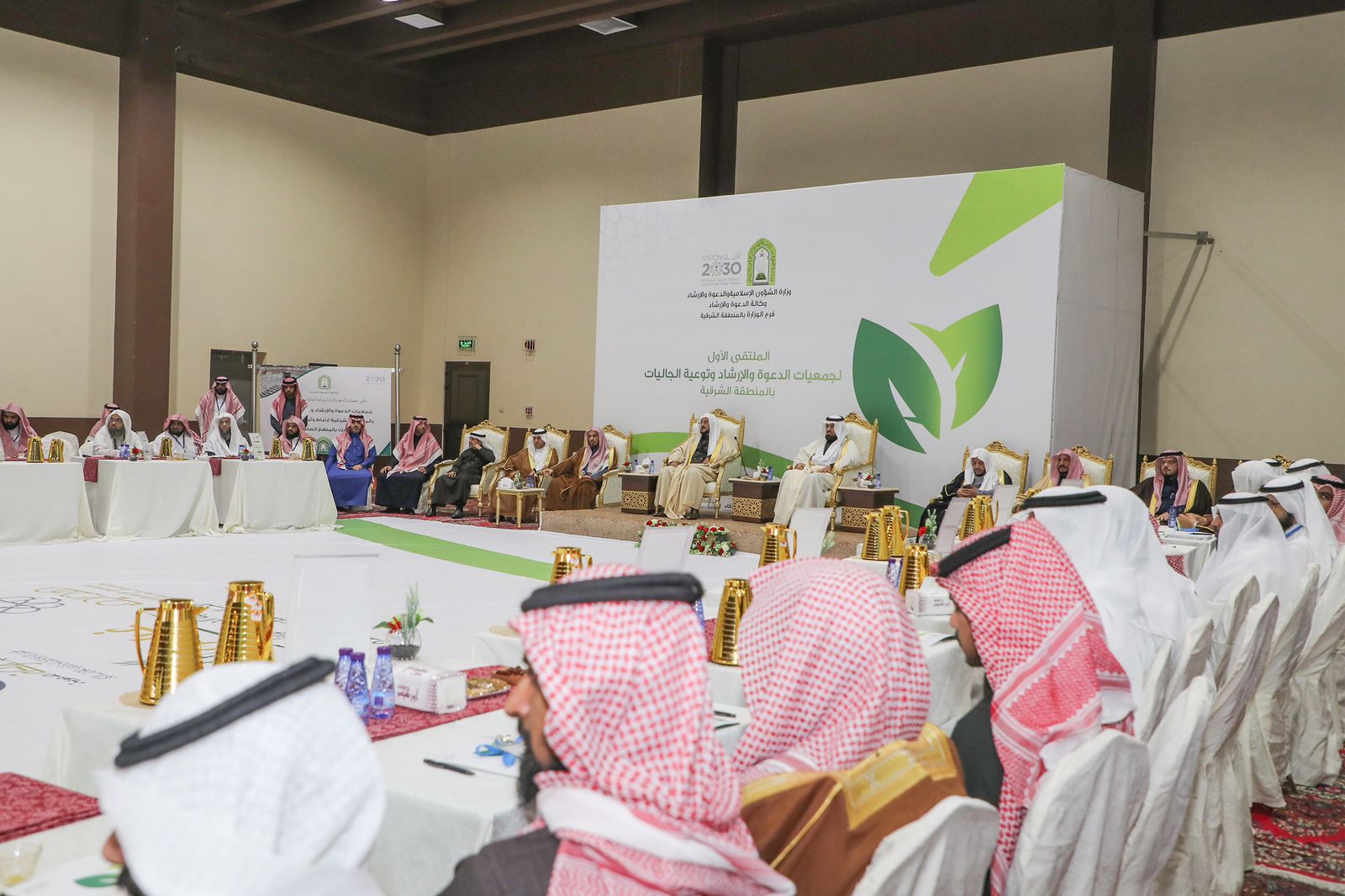 وافتتح الملتقى بكلمة لوزير الشؤون الإسلامية والدعوة والإرشاد الشيخ الدكتور عبداللطيف بن عبدالعزيز آل الشيخ أكد فيها حرص القيادة الرشيدة المتمثلة في خادم الحرمين الشريفين وسمو ولي عهده الأمين ــ حفظهم الله ــ على الدَّعوة إلى الله، ودعم كل ما يحقق إيضاح صورة الإسلام الوسطي المعتدل لكافة شرائح المجتمع، وأهمية دور جمعيات الدعوة والإرشاد وتوعية الجاليات في نشر الدعوة إلى الله واستشعار المسؤولية في ذلك، والتأكيد على العناية بالدعوة إلى التوحيد وسلامتها من البدع والانحراف، وفق منهج سلف الأمة من الصحابة والتابعين ومن تبعهم بإحسان.