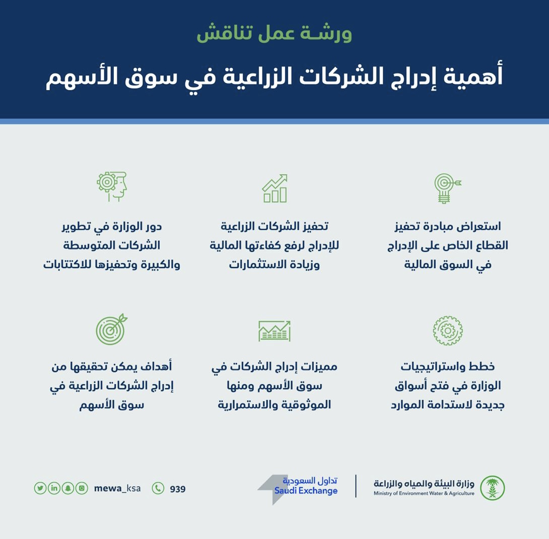 وتناولت الورشة سبل استقطاب الشركات الخاصة من قطاعات اقتصادية متنامية ومتنوعة، لا سيما قطاعات البيئة والمياه والزراعة لزيادة مساهمتها في الناتج المحلي الإجمالي، كما استعرضت مميزات إدراج الشركات في سوق الأسهم، ومنها الموثوقية والاستمرارية، إضافة إلى الأهداف التي يمكن تحقيقها من خلال إدراج الشركات الزراعية بشكل خاص، حيت تعد سوق الأسهم السعودية من أكبر الأسواق المالية في الشرق الأوسط وشمال إفريقيا، والتاسعة على مستوى العالم.