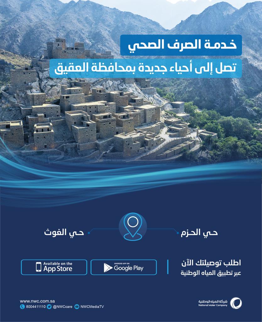 ودعت الشركة عملاءها في حيي (الحزم والغوث) بمحافظة العقيق بمنطقة الباحة، لتقديم طلبات إيصال توصيلات الصرف الصحي من خلال قنواتها الرقمية.