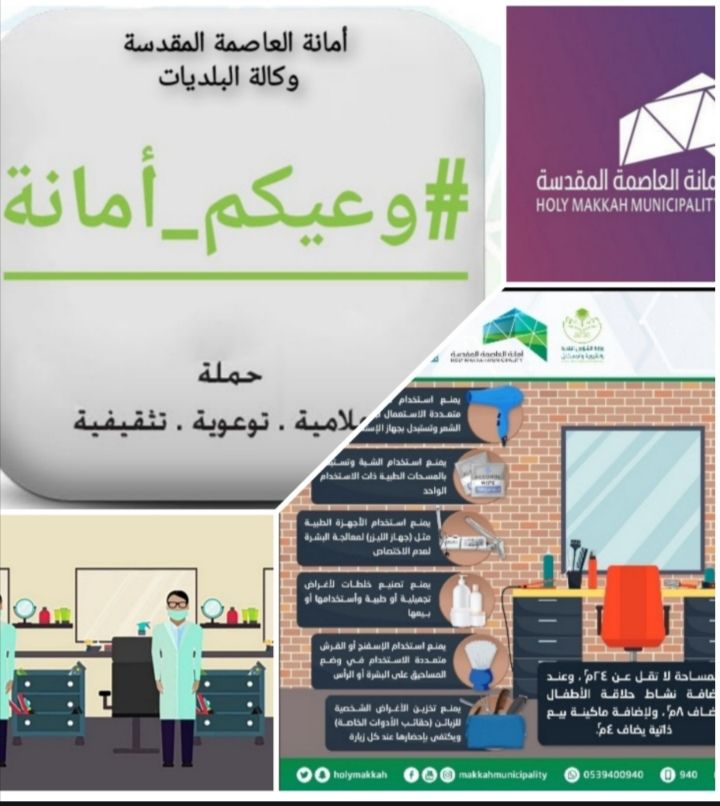 تواصل وكالة البلديات بأمانة العاصمة المقدسة متمثلة في الادارة العامة للتراخيص وسلامة الغذاء والتوعية الصحية ، وادارة الرقابة على الانشطة النسائية ، حملاتها الرقابية والتوعوية المكثفة تحت شعار “وعيكم أمانة” ، على صالونات الحلاقة الرجالية ومراكز التجميل النسائية ، وذلك من خلال تفعيل الجوانب التوعوية للتثقيف الصحي ، حيث تم تصميم ملصقات توعوية تتضمن العديد من العبارات والخطوات الإرشادية للتعريف بأفضل الطرق الصحية في مختلف مجالات تقديم الخدمات ، وهي عبارة عن ملصقات تثقيفية بالصور المعبرة مع شرح مبسط ، يتم لصقها في مكان بارز ، وذلك لترسيخ تلك الاشتراطات في أذهان العاملين في الخدمة والمستفيدين منها ، بالإضافة الى توضيح السلوكيات الخاطئة المطلوب تجنبها للعاملين بالمنشآت المتعلقة بهذا المجال ، وبهدف رفع درجة الوعي وإرشادهم الى أفضل الطرق الصحية في تقديم الخدمات وتعزيز العلاقات بين جميع الأطراف المعنية.
