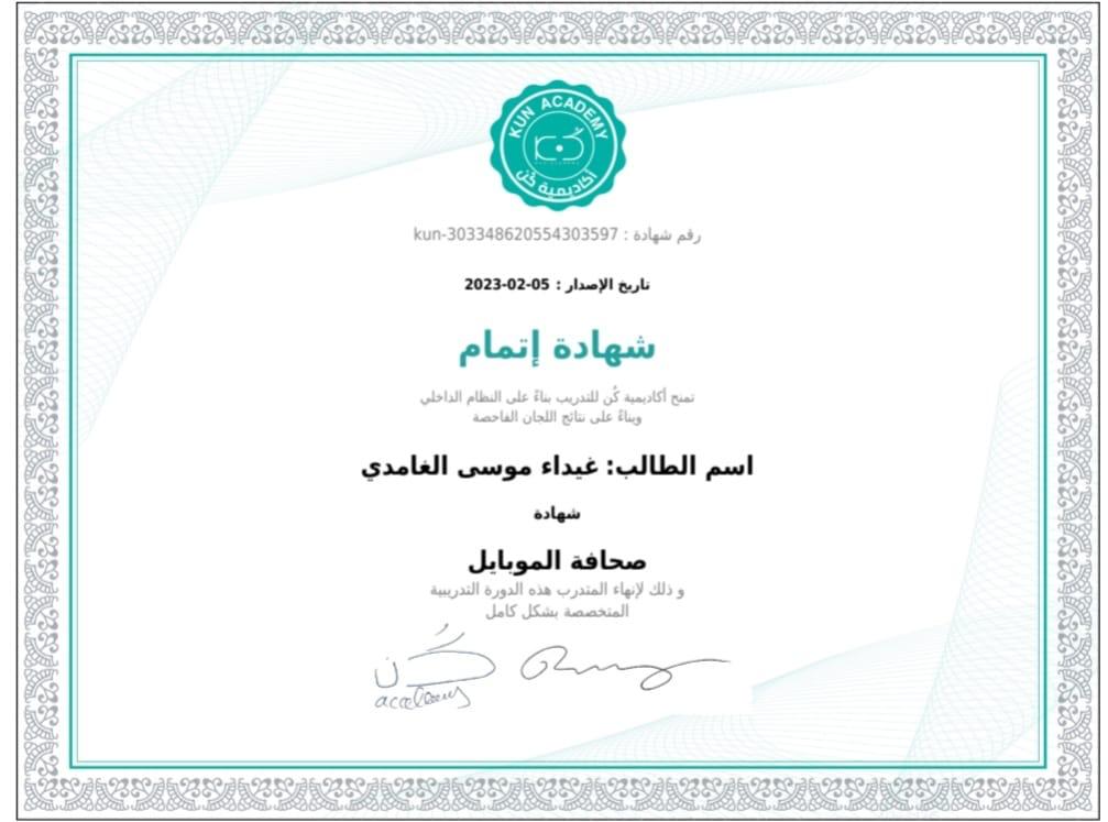 الإعلامية والكاتبة “غيداء الغامدي” تحصل على شهادة “صحافة الموبايل” بعد اجتيار الكورس التدريبي المكثف في تخصص صحافة الموبايل