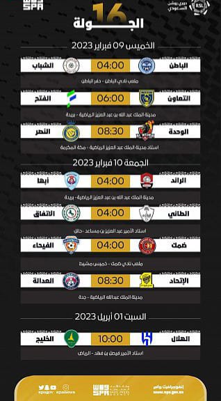 وتستكمل منافسات الجولة يوم الجمعة بإقامة أربع لقاءات، فعلى ملعب مدينة الملك عبدالله بن عبدالعزيز الرياضية ببريدة تقام مباراة تجمع فريق الرائد بأبها، في حين يستضيف فريق الطائي نظيره فريق الاتفاق على ملعب الأمير عبدالعزيز بن مساعد بحائل، فيما تلعب المباراة الثالثة في التوقيت ذاته على ملعب نادي ضمك بخميس مشيط ويتستضيف فيه صاحب الأرض نظيره فريق الفيحاء، على أن تقام المباراة الرابعة بين فريقي الاتحاد والعدالة على ملعب مدينة الملك عبدالله الرياضية بمدينة جدة في ختام لقاءات اليوم الثاني من الجولة الـ 16، فيما تبقى لقاء يجمع فريقي الهلال والخليج مؤجل على أن يقام في اليوم الأول من شهر أبريل القادم بسبب مشاركة فريق الهلال في منافسات كأس العالم للأندية والمقامة حالياً في المغرب .