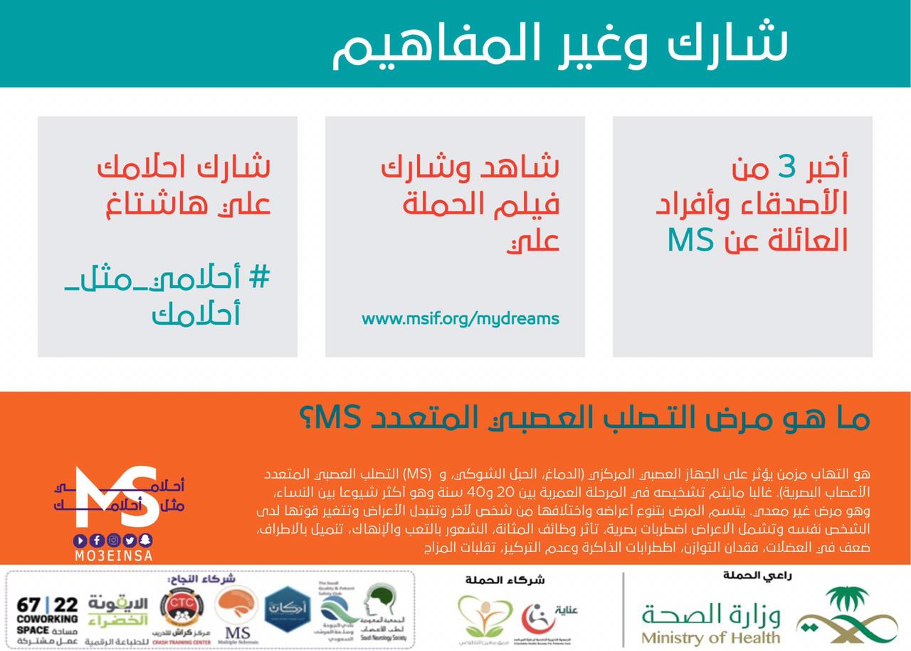 برعاية معالي وزارة الصحة د. توفيق الربيعة انطلقت الحملة الإقليمية الأولى بالمنطقة العربية لرفع الوعي بمرض التصلب العصبي 2018م وتستمر طيلة شهر نوفمبر تحت وسم #احلامي_مثل_احلامك .. بالشراكة مع الإتحاد الدولي للتصلب العصبي، قامت بتغطيتها العديد من الجمعيات والمراكز في الوطن العربي، حيث شاركت معها جمعية عناية لرعاية المرضى – وهي جمعية غير ربحيه- متمثلة بفريقها معين التطوعي الصحي.
