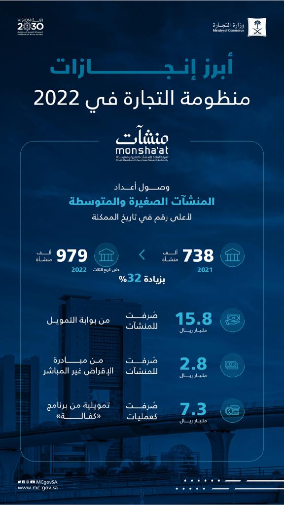 على صعيد المنشآت الصغيرة والمتوسطة، بلغ إجمالي المنشآت حتى نهاية الربع الثالث 2022م (979 ألف منشأة) بزيادة 32% عن العام 2021م، كما واصلت الهيئة العامة للمنشآت الصغيرة والمتوسطة تمكين رواد ورائدات الأعمال بصرف أكثر من 15.8مليار ريال عبر بوابة التمويل، وأكثر من 2,8 مليار ريال من مبادرة الإقراض غير المباشر، وصرف 7,3 مليار ريال من برنامج تمويل المنشآت الصغيرة والمتوسطة “كفالة”.