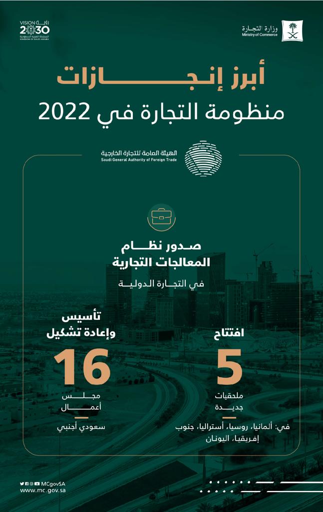 وصدر خلال العام 2022م نظام المعالجات التجارية في التجارة الدولية، وافتتحت الهيئة العامة التجارة الخارجية 5 ملحقيات تجارية جديدة في: ألمانيا وروسيا واستراليا وجنوب أفريقيا واليونان، وتم تأسيس وإعادة تشكيل 16 مجلس أعمال سعودي وأجنبي لتعزيز التجارة البينية واستغلال فرص استثمار القطاع الخاص.