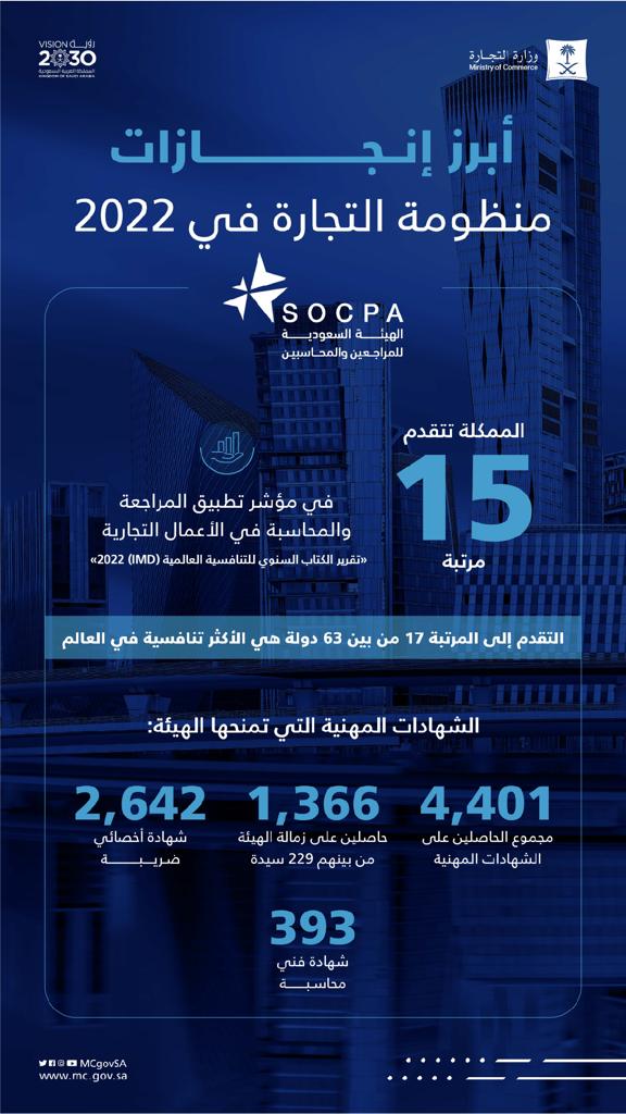 وساهمت جهود الهيئة السعودية للمراجعين والمحاسبين في تقدم المملكة 15 مرتبة في “مؤشر تطبيق المراجعة والمحاسبة في الأعمال التجارية” في تقرير الكتاب السنوي للتنافسية العالمية (IMD) 2022 لتصل إلى المرتبة 17 من بين أكبر 63 دولة تنافسية عالمياً.