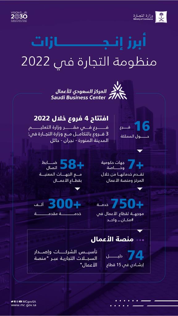 واهتمت وزارة التجارة في العام 2022م بتحفيز البيئة التجارية وتعزيز التشريعات بإصدار نظام الشركات الجديد لتحفيز المنظومة التجارية وتنميتها. وكشفت الوزارة عن زيادة الشركات المتحولة إلى “مساهمة مقفلة” بنسبة 27% حيث تم تمكين 208 شركات من التحول، وصدر خلال العام 314,949 سجل تجاري للشركات والمؤسسات بزيادة 6% عن 2021م.