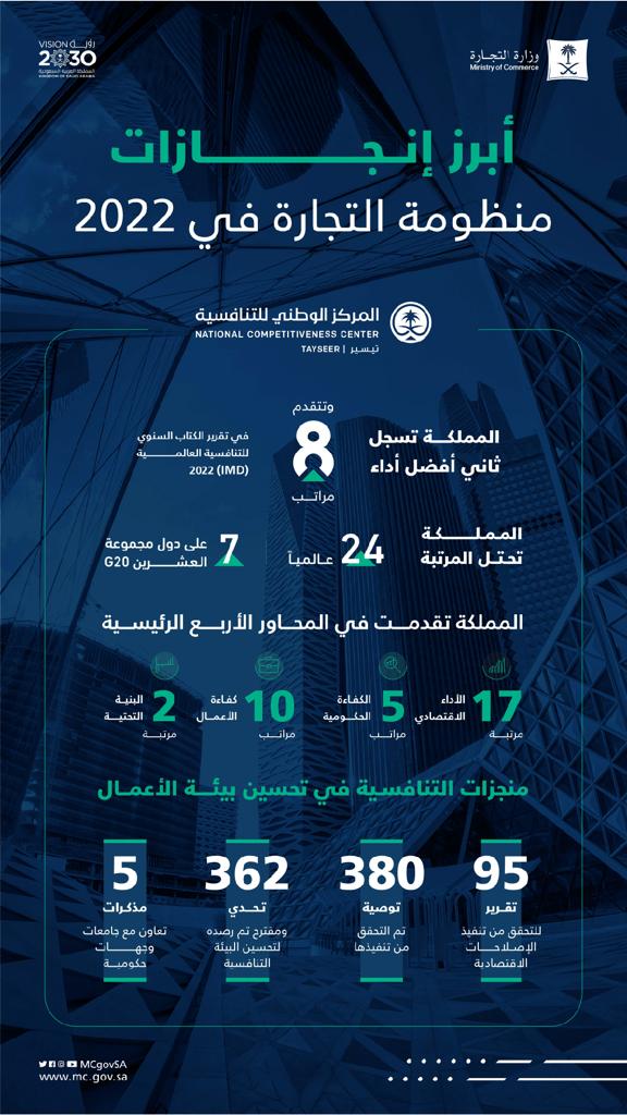 واصلت المملكة العربية السعودية تقدمها خلال العام 2022م في المؤشرات العالمية، حيث تقدمت ثمان مراتب بين الدول الأكثر تنافسية في العالم، محققةً ثاني أفضل أداء في تقرير الكتاب السنوي للتنافسية العالمية (IMD) 2022 ، متقدمةً في جميع المحاور الرئيسية، واحتلت المركز 24 عالمياً من بين 63 دولة، والسابع على مستوى دول مجموعة العشرين.