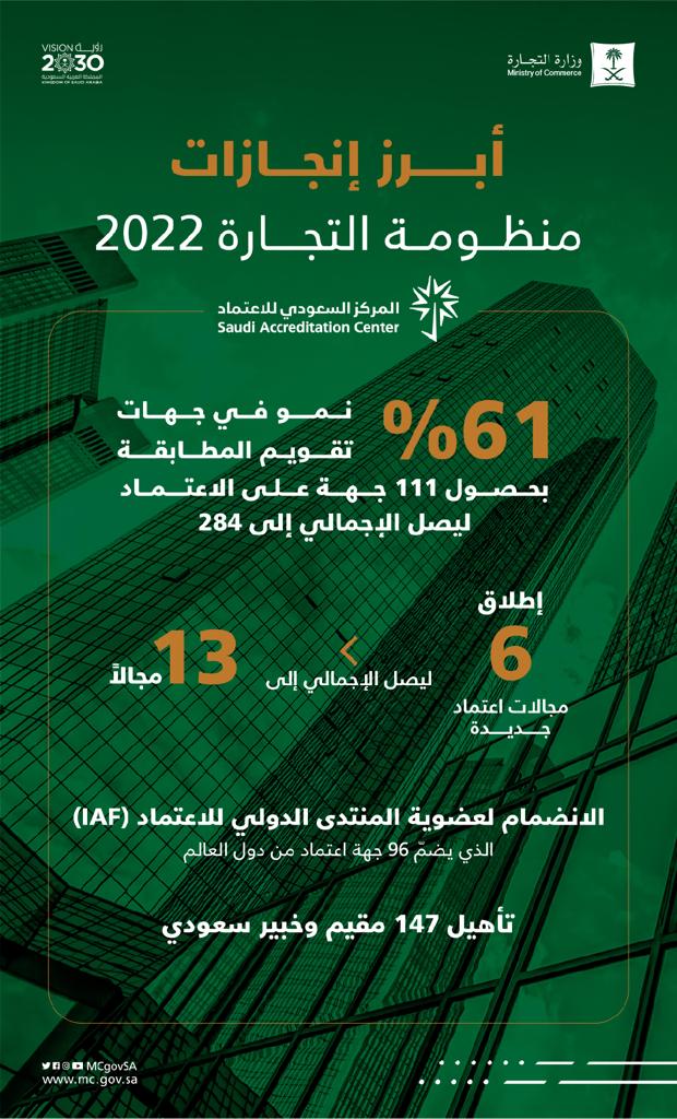 وسجل المركز السعودي للاعتماد نمواُ بنسبة 61% في جهات تقويم المطابقة بحصول 111 جهة على الاعتماد ليصل إجماليها إلى 284 جهة، وانضم المركز إلى عضوية المنتدى الدولي للاعتماد الذي يضم 96 جهة اعتماد من دول العالم.