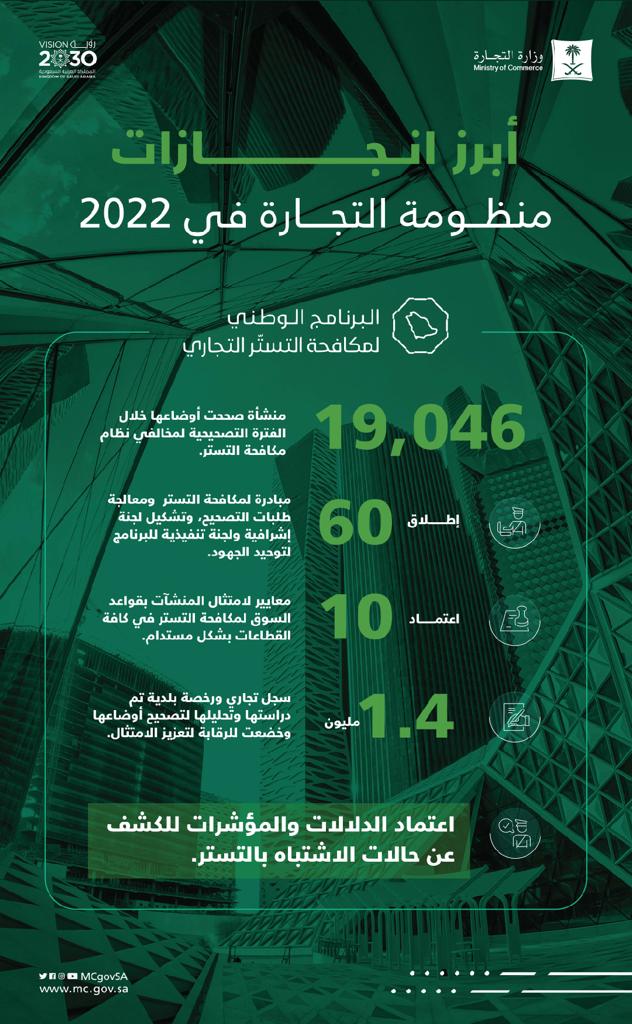 وأثمرت الفترة التصحيحية لمخالفي نظام مكافحة التستر عن تصحيح أوضاع 19,046منشأة. كما تم دراسة وتحليل 1,4 مليون سجل تجاري ورخصة بلدية لتصحيح أوضاعها وخضعت للرقابة لتعزيز الامتثال. وأطلق البرنامج الوطني لمكافحة التستر التجاري 60 مبادرة لمكافحة التستر ومعالجة طلبات التصحيح، واعتمد 10 معايير لامتثال المنشآت بقواعد السوق لمكافحة التستر في كافة القطاعات بشكل مستدام.