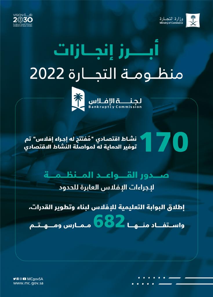 وساهمت لجنة الإفلاس في توفير الحماية لـ 170 نشاطاً اقتصادياً مفتتح له اجراء إفلاس لمواصلة النشاط الاقتصادي، كما أصدرت اللجنة القواعد المنظمة لاجراءات الافلاس العابرة للحدود وأطلقت البوابة التدريبية للإفلاس لبناء وتطوير القدرات استفاد منها 682 ممارس ومهتم.