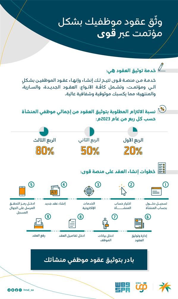 وأشارت إلى نسبة الالتزام المطلوبة بتوثيق العقود من إجمالي موظفي المنشأة حسب كل ربع من عام 2023، والتي تتمثل في 20% بالربع الأول، و50% للثاني، و80% في الثالث.