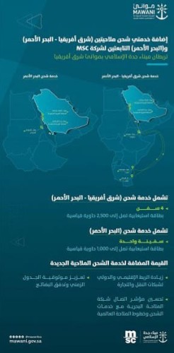 أعلنت الهيـئة العـامة للمـوانئ “مــوانئ” اليوم، عن إضافة شركة البحر الأبيض المتوسط للملاحة (MSC) خدمتي شحن ملاحيتين “شرق أفريقيا – البحر الأحمر”، و”البحر الأحمر” إلى ميناء جدة الإسلامي، بما يُعزز عملية تدفق البضائع الصادرة والواردة من وإلى المملكة.