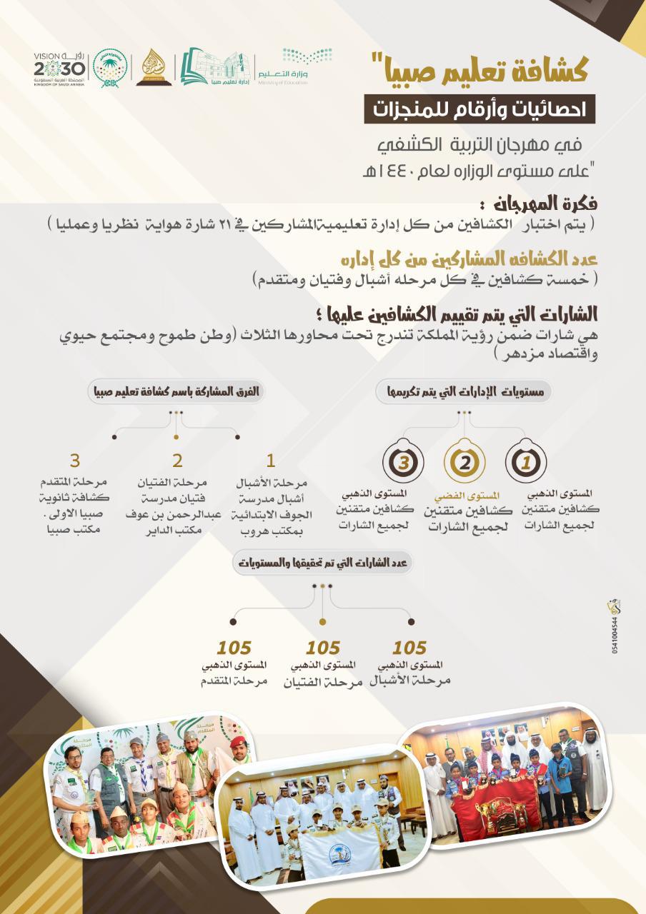 حققت فرق إدارة تعليم صبيا الكشفية المركز الأول والبيرق الذهبي وذلك ضمن مشاركتها في مهرجانات التعليم للتربية الكشفية والتي أقيمت ضمن خطة وكالة الوزارة للتعليم، حيث حصدت الإدارة من خلالها المستوى الذهبي في جميع المنافسات الثلاث لمراحل الأشبال والمقامة بحائل والفتيان بإدارة تعليم الجوف وأخيرا للمتقدم والتي استضافتها الإدارة العامة للتعليم بمنطقة جازان  ويأتي هذا التتويج بعد أن حصلت جميع الفرق المشاركة من إدارة تعليم صبيا على وشاح التميز للمستوى الذهبي، واجتيازهم بجدارة لمتطلبات 315 شارة هواية كشفية ضمن آلية منافسات المهرجان والتي تندرج تحت محاور رؤية المملكة 2030 الثلاث وطن طموح ومجتمع حيوي واقتصاد مزدهر وأوضح رئيس قسم النشاط الطلابي إبراهيم شامي أنه قد مثل الإدارة في هذه المشاركات أشبال الفرقة الكشفية بمدرسة الجوف الابتدائية التابع لمكتب التعليم بهروب بقيادة الأستاذ عبده غاوي, وفتيان متوسطة عبدالرحمن بن عوف بمكتب تعليم الداير بقيادة الأستاذ طارق المالكي, وكشافي ثانوية صبيا الأولى بمكتب تعليم صبيا بقيادة الأستاذ أحمد عروي ضمن مرحلة المتقدم، نافسوا فيها أكثر من ٣٠ إدارة تعليمية في عدد من المجالات، مشيراً إلى أن تحقيق المستوى الذهبي في جميع المنافسات الثلاث لم يحققه سوى كشافة تعليم صبيا وكشافة إدارة تعليم الرياض وأكد مساعد مدير تعليم صبيا الأستاذ ربيع بن مهدي عطية على أن المهرجان يهدف لتقديم العديد من القيم التربوية والوطنية والمهارات والفنون الكشفية، وغرس روح الاعتزاز بالدين والولاء للملك والانتماء للوطن ، كما يسهم المهرجان في صقل شخصية الكشاف من خلال البرامج المقدمة، والخبرات المكتسبة و تلاقح الخبرات بين الإدارات التعليمية من جانبه هنأ مدير تعليم صبيا الأستاذ ضيف الله بن علي الحازمي قسم النشاط الطلابي والفرق الكشفية المشاركة على جهودهم التي بذلوها ما أثمر عن تحقيقهم مراكز متميزة في مهرجان التعليم للتربية الكشفية، الأمر الذي يسهم في مساعدة الطلاب على اكتشاف مواهبهم وقدراتهم من خلال تقديم نماذج تطبيقية للأنشطة الكشفية المتنوعة، وتطوير المهارات اللازمة والضرورية في مضامين التربية الكشفية كما ثمن مدير تعليم صبيا حرص وزارة التعليم ممثلة في وكالة الأداء التعليمي (النشاط الطلابي الكشفي) على إقامة مثل هذه البرامج والفعاليات والتي تحظى برعاية واهتمام من معالي وزير التعليم ومعالي نائبه، لما لها من دور بارز في إنشاء جيل واعٍ محبٍ لقادته وقادر على بناء وطنه، متمنياً للجميع دوام التوفيق والسداد .