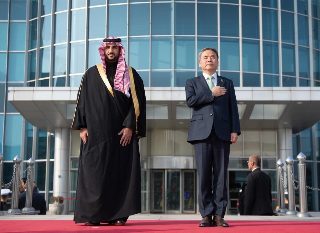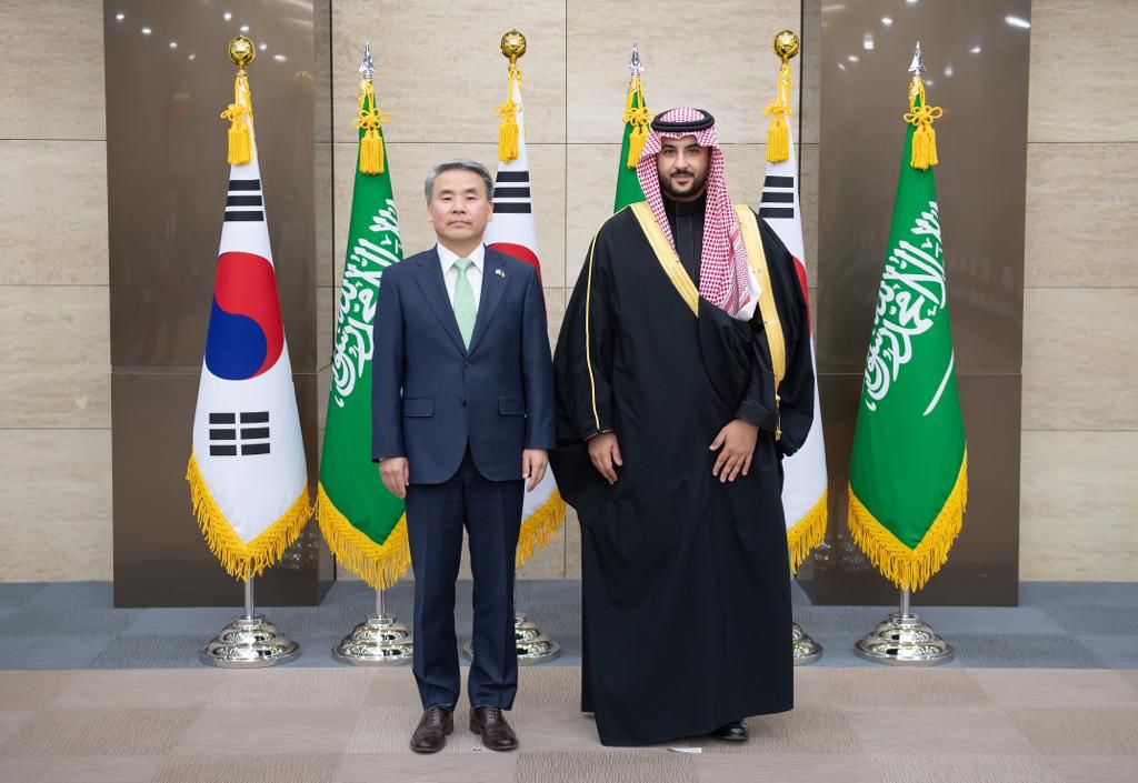 استقبل معالي وزير الدفاع الوطني في جمهورية كوريا لي جونغ سوب، صاحب السمو الملكي الأمير خالد بن سلمان بن عبدالعزيز وزير الدفاع، وذلك في ميدان الاستعراض العسكري بمقر وزارة الدفاع الوطني الكورية في العاصمة سيئول، حيث أجريت لسموه مراسم استقبال رسمية، أطلقت خلالها المدفعية 19 طلقة ترحيبية، تعبّر عن أعلى درجات الحفاوة والترحيب، ثم عُزف السلامان الملكي السعودي والوطني الكوري.