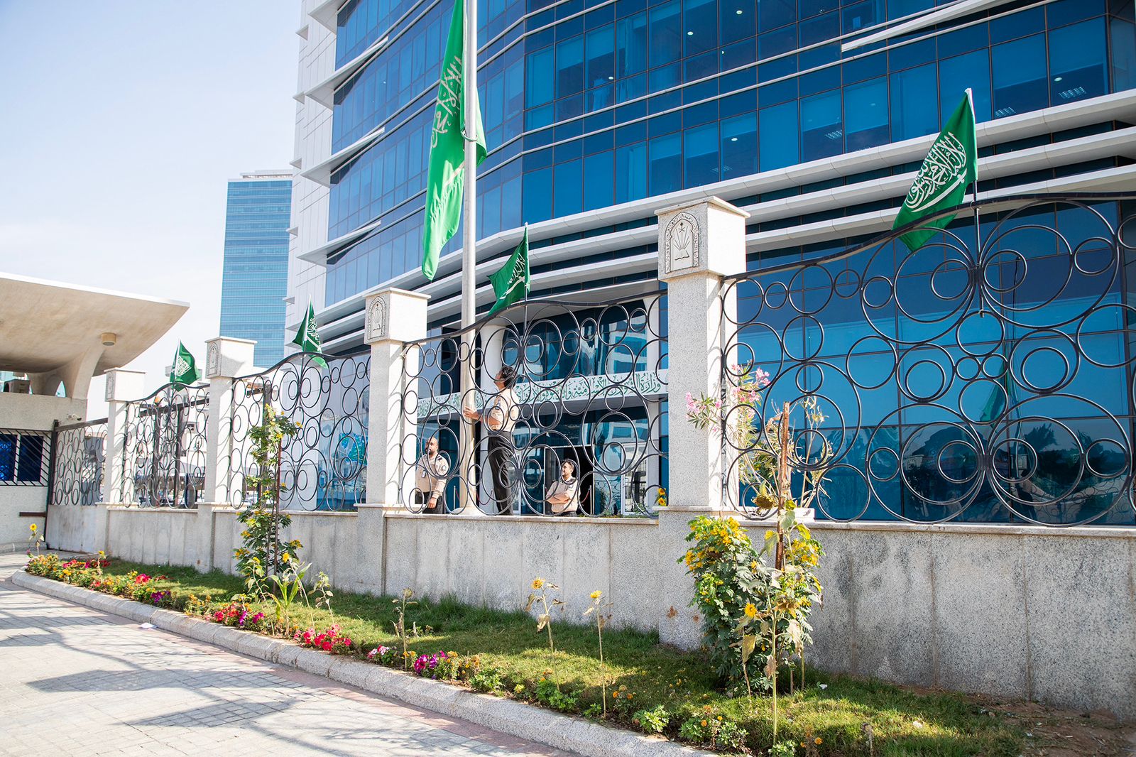 وقامت الوزارة بتركيب مجموعة كبيرة من الاعلام على اروقة واسوار برج الوزارة وتزينت شاشاتها الالكترونية بصور علم السعودية وعبارات تجسد رمزية العلم ومكانته وما يحمل من مضامين سامية.