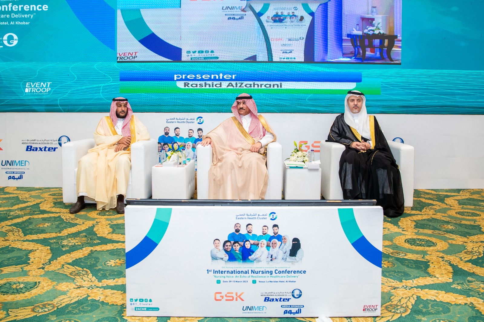 برعاية صاحب السمو الملكي الأمير سعود بن نايف بن عبدالعزيز آل سعود أمير المنطقة الشرقية “حفظه الله”، افتتح سعادة وكيل إمارة المنطقة الشرقية الدكتور خالد بن محمد البتال المؤتمر العالمي الأول للتمريض تحت شعار “صوت التمريض 2023″، والذي ينظمه تجمع الشرقية الصحي في فندق مرديان الخبر، وذلك بحضور عدد مدراء القطاعات الحكومية والصحية بالمنطقة ونخبة من المتحدثين الدوليين والمحليين لبحث آخر المستجدات في المجال.