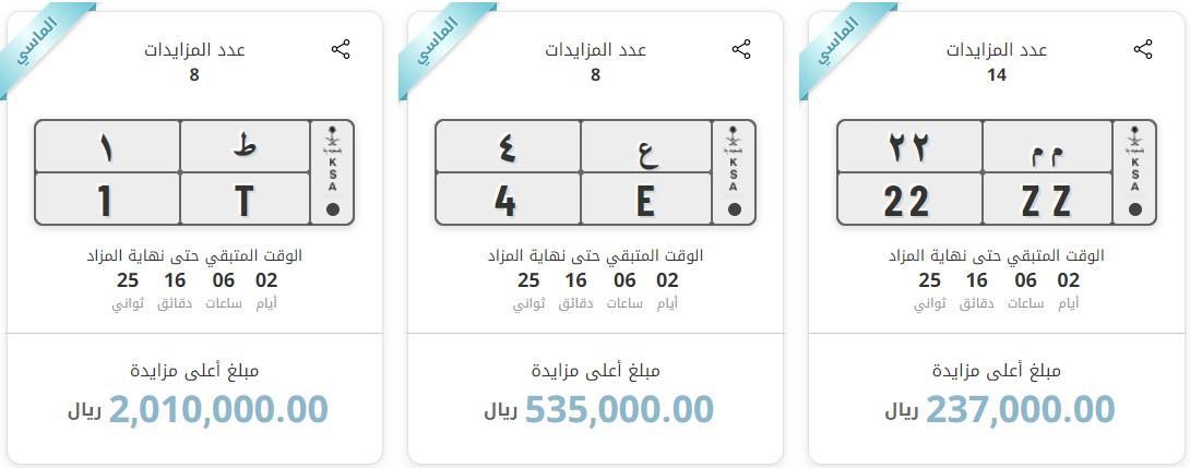 فيما حققت اللوحة “ع 4” 525 ألف ريال، واللوحة “م م 22” 235 ألف ريال، في المزاد الذي يستمر لمدة يومين.