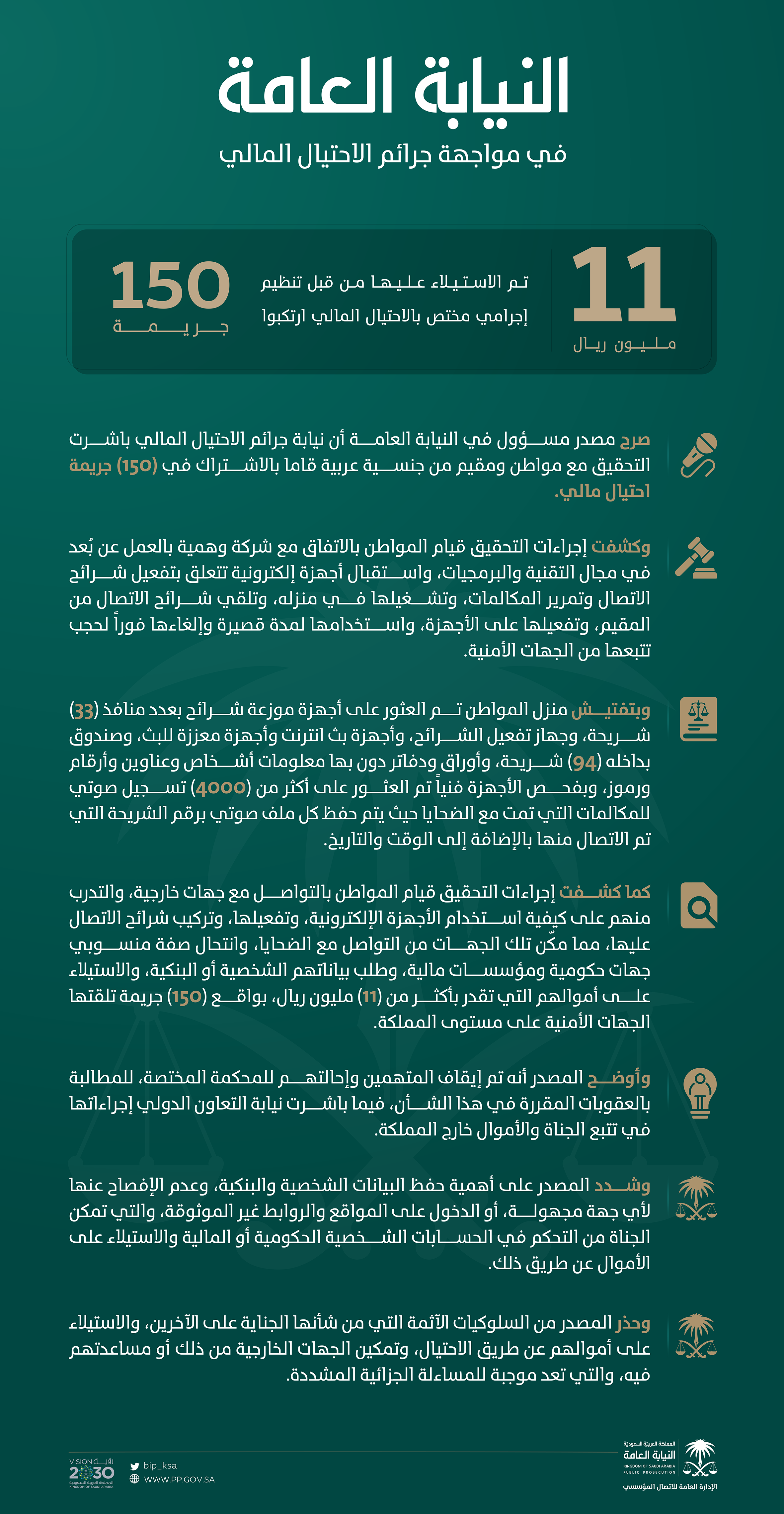 صرح مصدر مسؤول في النيابة العامة: أن نيابة جرائم الاحتيال المالي باشرت التحقيق مع مواطن ومقيم من جنسية عربية قاما بالاشتراك في (١٥٠) جريمة احتيال مالي.
