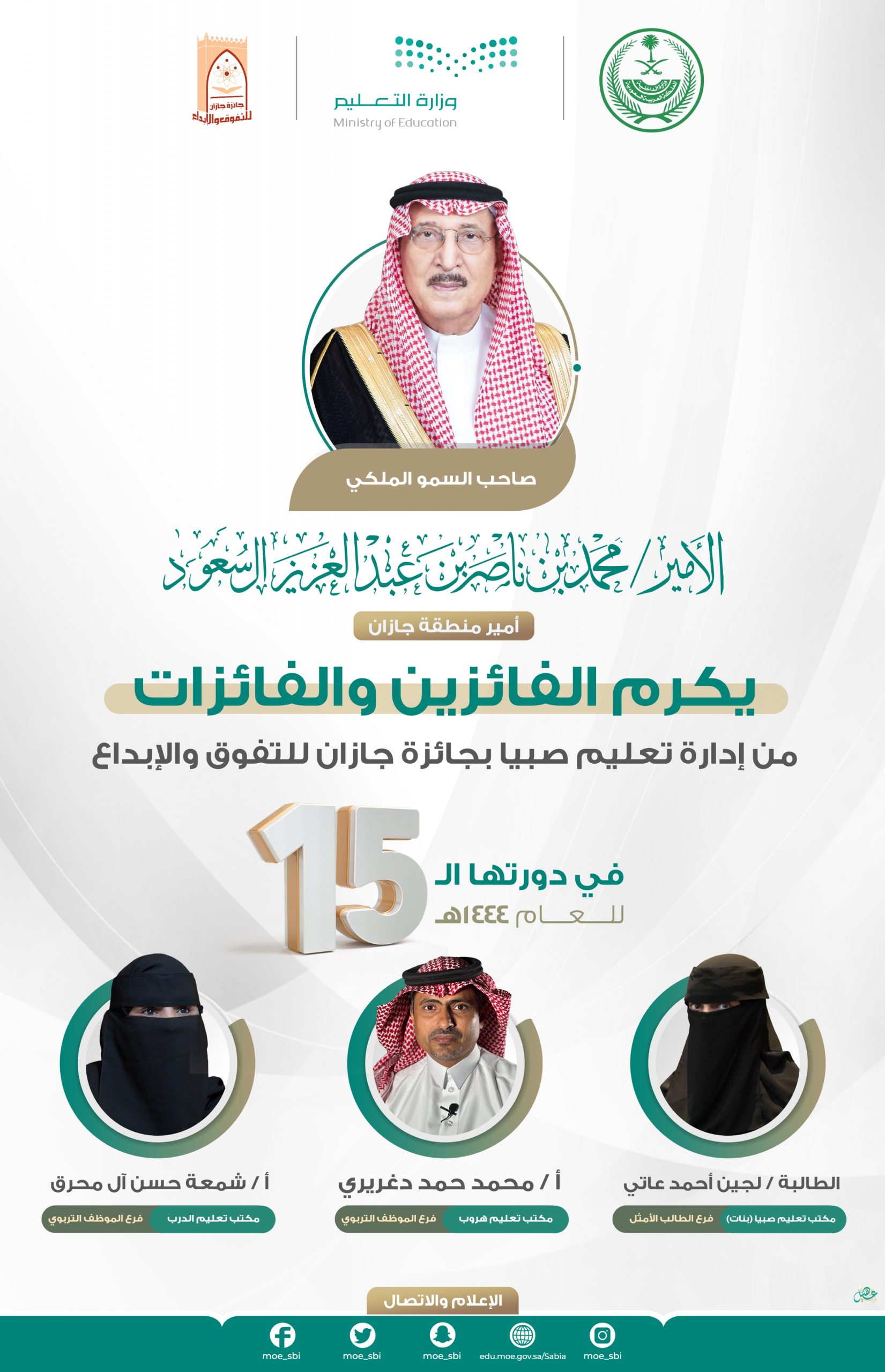 ضمن الفائزين بجائزة جازان للتفوق والإبداع في دورتها الخامسة عشرة؛ كرم أمير منطقة جازان صاحب السمو الملكي الأمير محمد بن ناصر بن عبد العزيز ثلاثة فائزين من منسوبي إدارة تعليم صبيا في ثلاثة مجالات، وهم لجين أحمد عاتي فرع الطالب الأمثل، شمعة حسن المحرق فرع الموظف التربوي، محمد حمد دغريري فرع الموظف التربوي، جاء ذلك خلال رعاية سموه لحفل الجائزة مساء الأحد الموافق 19-3-2023 بقاعة الاحتفالات بفندق جراند ميلينيوم جازان.