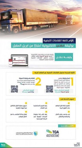 وأوضحت الهيئة العامة للنقل أن الآلية المعتمدة لضبط عمليات النقل بالمركبات غير السعودية القاصدة والعابرة لأراضي المملكة أكدت على اقتصار عمليات نقل البضائع داخل المملكة على الناقل الوطني المرخصة وعدم تعاقد التجار والمصانع والمستوردين والمؤسسات والشركات مع مركبات النقل غير السعودية للنقل داخل المملكة، كما سمحت للشاحنات غير السعودية بنقل البضائع من خارج المملكة إلى مدينة وصول محددة أو نقل البضائع في طريق عودتها إلى الدولة القادمة منها من مدينة الوصول نفسها أو المدن التي تقع على مسار طريق العودة، وغير ذلك يتطلب الحصول على تصريح من قِبل الهيئة العامة للنقل.