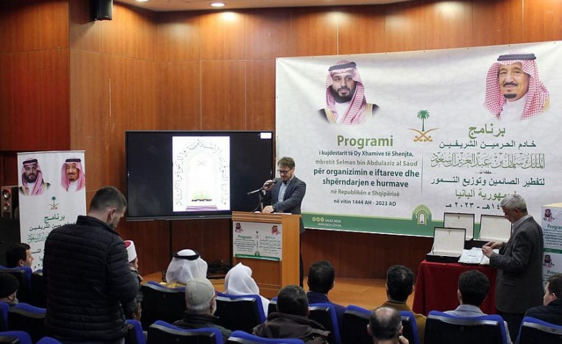 دشنت وزارة الشؤون الإسلامية والدعوة والإرشاد, برنامجي هدية خادم الحرمين الشريفين للتمور وتفطير الصائمين خلال شهر رمضان المبارك لعام 1444هـ، في مدرسة تيرانا الشرعية التابعة للمشيخة الإسلامية بألبانيا, بحضور سفير خادم الحرمين الشريفين لدى جمهورية ألبانيا فيصل بن غازي حفظي، ورئيس المشيخة الإسلامية في ألبانيا الشيخ بويار سباهو، وعدد من الشخصيات الإسلامية الألبانية.