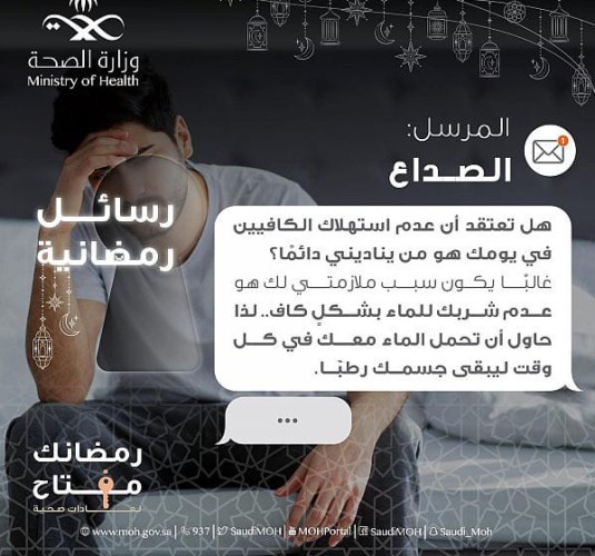 شددت وزارة الصحة على ضرورة وأهمية شرب الماء بشكل كافي وعدم التهاون في ذلك، وذلك ضمن حملتها التوعوية التي أطلقتها تحت شعار” رمضان مفتاح ” ، حيث نشرت الوزارة عبر منصاتها الإعلامية انفوجرافيك، تتضمن رسالة افتراضية عن الصداع وأثره على شرب الماء بشكل كافِ ليبقى الجسم رطباً, جاء في مضمون الرسالة أن الاعتقاد في عدم استهلاك الكافيين في اليوم هو من ينادي دائما بالصداع والحقيقة هي أن غالباً ما يكون سبب ملازمته هو عدم شرب الماء بشكل كافِ؛ لذا حاول أن تحمل الماء معك في كل وقت ليبقى جسمك رطبًا.