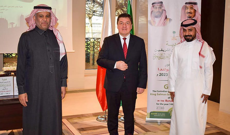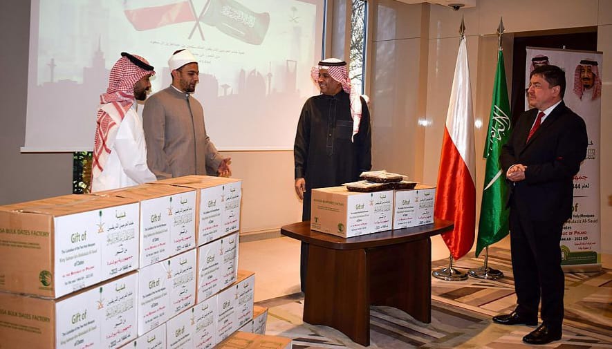 دشنت وزارة الشؤون الإسلامية والدعوة والإرشاد، أمس، هدية خادم الحرمين الشريفين الملك سلمان بن عبدالعزيز آل سعود من التمور لجمهورية بولندا، بمناسبة شهر رمضان 1444هـ، بحضور سفير خادم الحرمين الشريفين لدى بولندا سعد بن صالح الصالح، ومفتي الديار البولندية رئيس الاتحاد الديني الإسلامي الشيخ أحمد توماش ميشكيفيتش، وإمام المركز الثقافي الإسلامي في وارسو الشيخ محمود سميح.