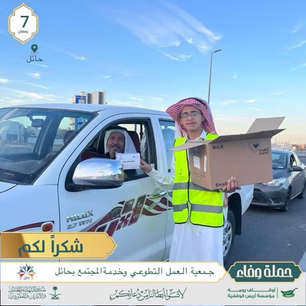 نفذت جمعية العمل التطوعي وخدمة المجتمع في منطقة حائل “جود”، وبدعم من مؤسسة أريس الوقفية، حملة توزيع وجبات إفطار خفيفة عبارة عن “ماء وتمر ومعمول” للصائمين؛ وذلك عند الإشارات في مدينة حائل.