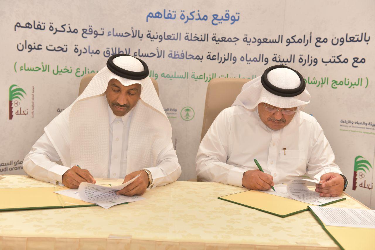 إنطلاق مبادرة جمعية النخلة التعاونية بالأحساء وفرع وزارة البيئة والمياه والزراعة بالمنطقة الشرقية ممثلاً بمكتب الوزارة بمحافظة الأحساء في إطار التعاون المشترك بين الجهات الحكومية والقطاعات الخاصة بما يسهم في تحقيق رؤية المملكة 2030م من خلال خدمة المجتمع وقعت جمعية النخلة التعاونية بالأحساء ويمثلها رئيس الجمعيه المهندس وليد بن حسن العفالق مذكرة تفاهم مع مكتب وزارة البيئة والمياه والزراعة بمحافظة الأحساء ويمثله سعادة مدير عام المكتب المهندس / إبراهيم بن خليل الخليل وتستهدف المبادرة تدريب 120 مزارع من ذوي الحيازات الصغيرة والمتوسطة على أن يتولى المكتب تدريب المزارعين وتطبيق المبادرة التي تأتي بعنوان ( البرنامج الإرشادي التدريبي والممارسات الزراعية الحديثة بمزارع نخيل الأحساء) وقد تم توقيع الاتفاقيات بغرفة الأحساء ويأتي الهدف من هذه المبادرة رفع كفاءة الإدارة الزراعية وتحسين مهارات المزارعين واكسابهم المعارف الحديثه في الإنتاج الزراعي بشكل عام والنخيل بشكل خاص تحقيقاً لأحد أهم مرتكزات رؤية المملكة 2030م في الوصول إلى الأمن الغذائي والاستدامة في المجال الزراعي وبالممارسات السليمة .