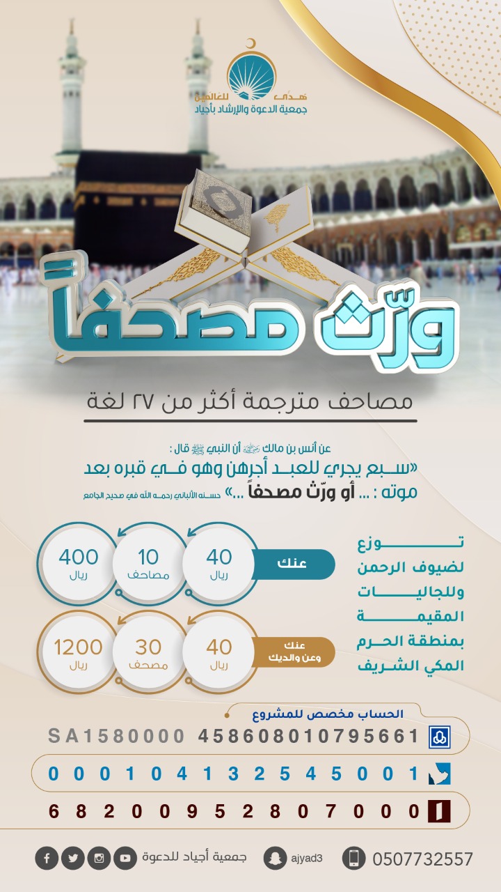 تواصل جمعية الدعوة والإرشاد وتوعية الجاليات بأجياد في مكة المكرمة تنفيذ مشروعها “ورث مصحفًا” والذي يُعنى بتوزيع المصاحف المترجمة لأكثر من 27 لغة عالمية على ضيوف الرحمن من المعتمرين والجاليات وسكان البيئة المحيطة بمنطقة الحرم, حيث يستهدف المشروع للوصول إلى توزيع مليون مصحف بإذن الله تعالى تزامناً مع توافد الأعداد الكبيرة من المعتمرين.