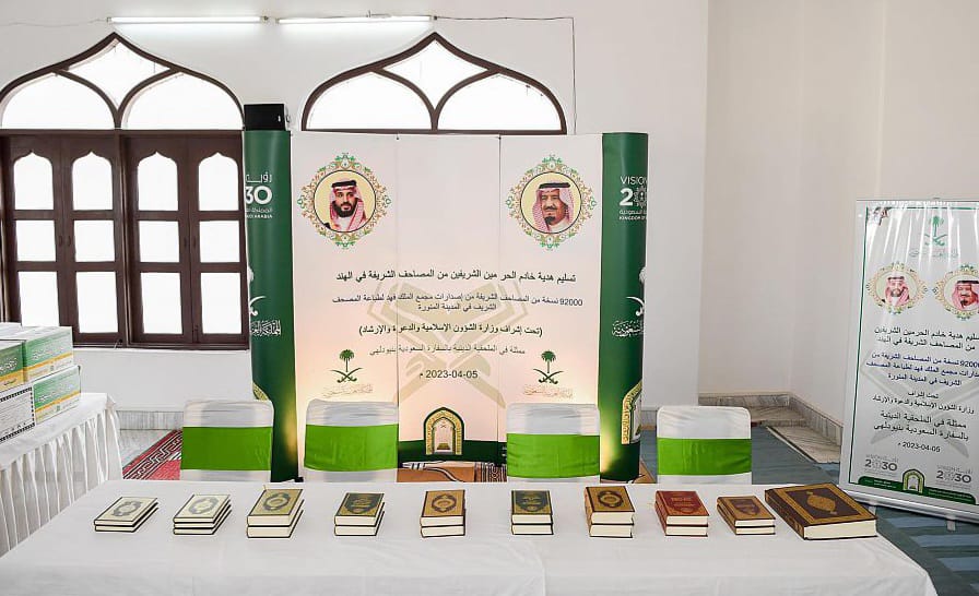 وفي ختام الحفل سلم الملحق الديني بسفارة خادم الحرمين بالهند عدداً من الجمعيات والمؤسسات الإسلامية في الهند نسخاً من المصحف الشريف مترجمة إلى اللغات الهندية، كما ستباشر الملحقية الدينية توزيع الهدية خلال أيام شهر رمضان المبارك على الجمعيات والمراكز الإسلامية .