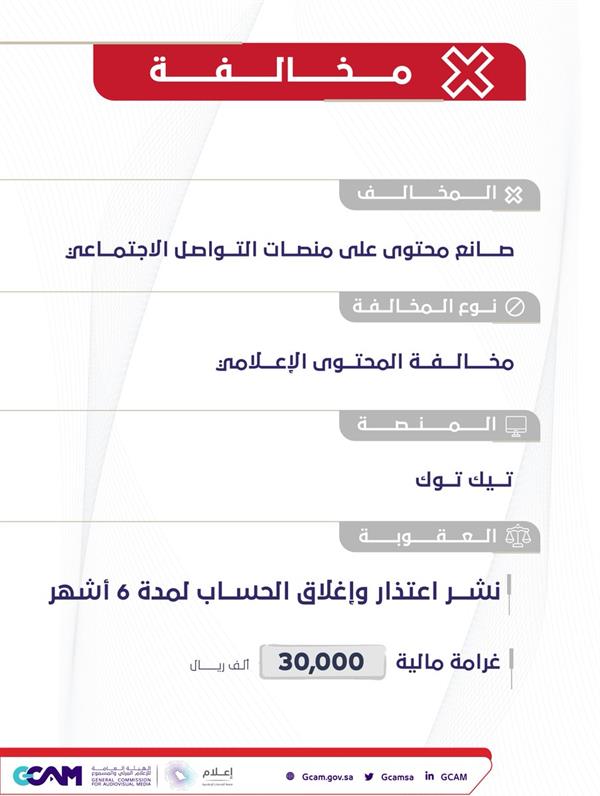 وتضمنت العقوبة على المخالف نشر اعتذار وإغلاق الحساب لمدة 6 أشهر، وغرامة مالية قدرها 30 ألف ريال.