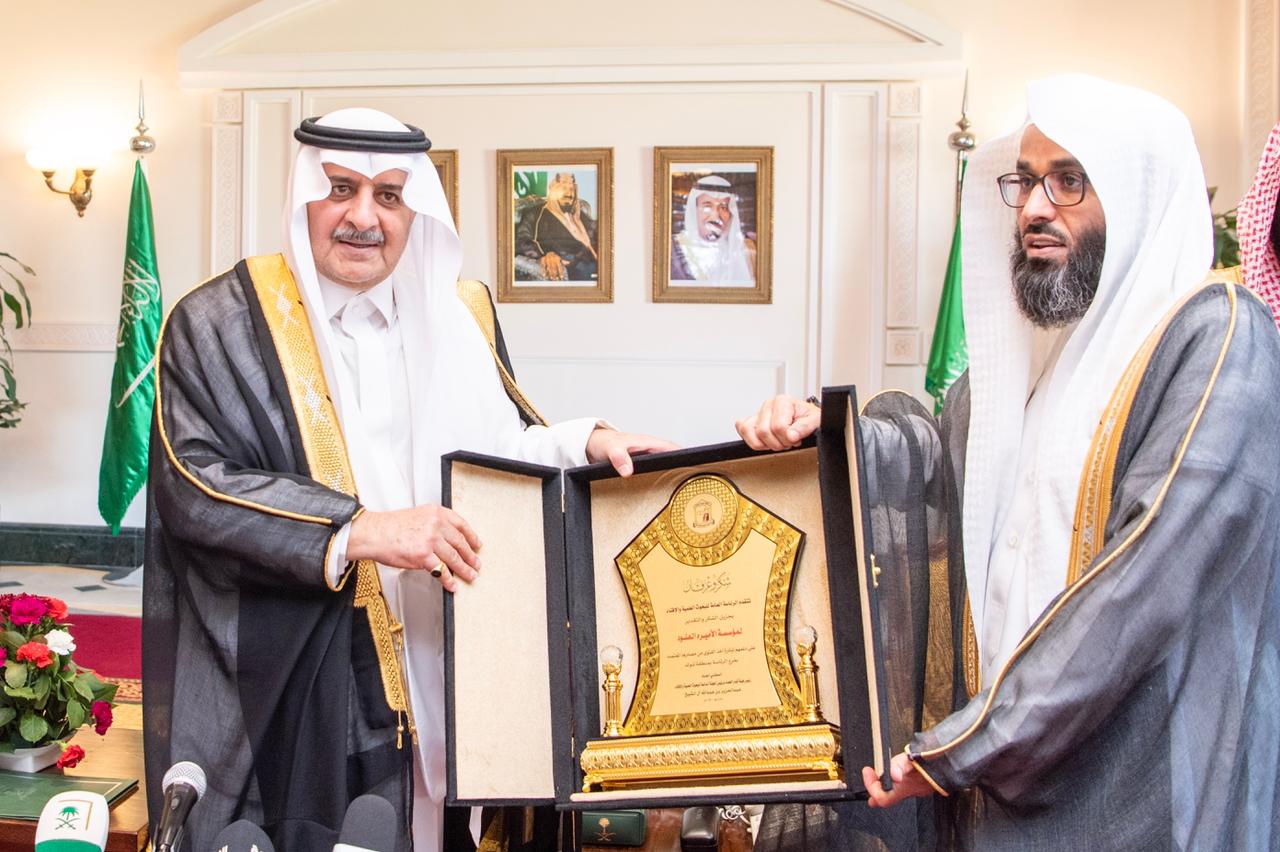 وأكد سموه بأننا نحن هنا في منطقة تبوك وفي كل مناطق المملكة تسير تحت توجيه كريم من قبل خادم الحرمين الشريفين الملك سلمان بن عبدالعزيز آل سعود وسمو ولي عهده الأمين – حفظهما الله – برؤية واضحة صريحة أساسها الكتاب والسنة، وأساسها تمسكنا بعقيدتنا والحمد لله نحن على خير وبلادنا بخير وستكون على خير بإذن الله . وفي ختام الحفل تسلم سموه درعًا تذكارية من سماحة المفتي بهذه المناسبة .