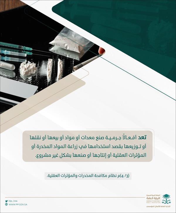 وأضافت أن الإقدام على هذه الأفعال بغرض زراعة المؤثرات العقلية أو إنتاجها أو صنعها بشكل غير مشروع، يعُد من الأفعال الجرمية التي يعاقب عليها نظام مكافحة المخدرات والمؤثرات العقلية.