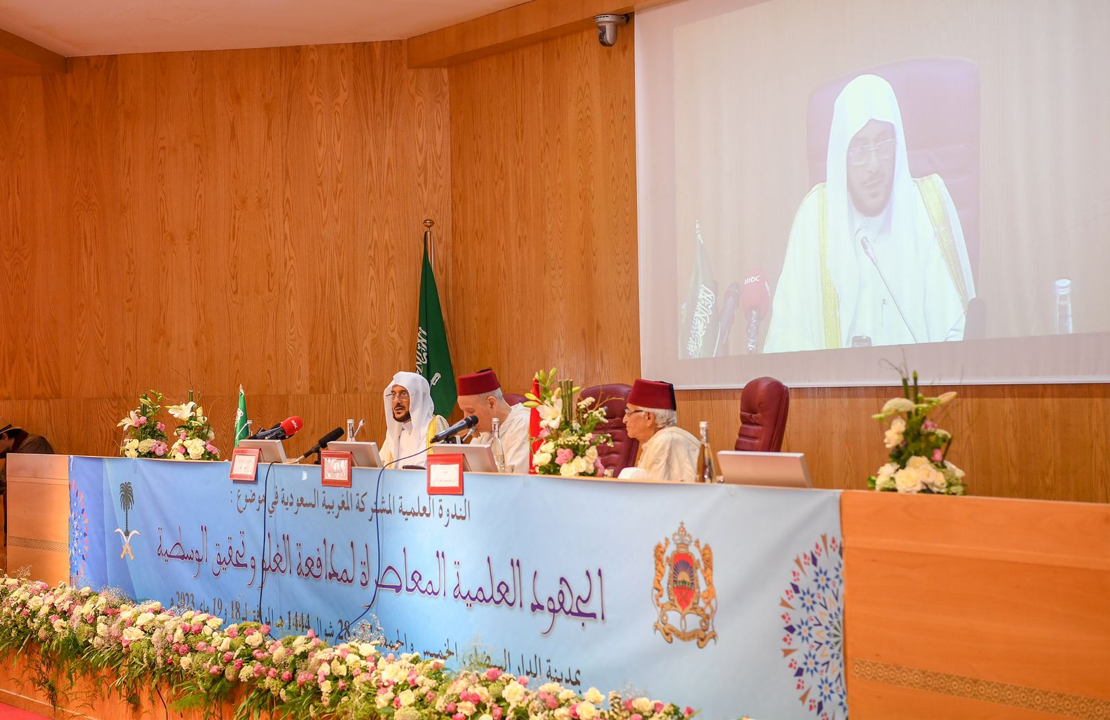 وألقى معالي الوزير آل الشيخ خلال الجلسة الافتتاحية للندوة كلمة نوه فيها بالجهود العظيمة التي يقوم بها خادم الحرمين الشريفين وسمو ولي عهده الأمين حفظهم الله في بيان رسالة الإسلام السمحة القائمة على الوسطية والاعتدال ومحاربة الغلو والتطرف، كما قدم معاليه الشكر الجزيل لجلالة الملك محمد السادس ملك المملكة المغربية – حفظه الله -على جهوده الطيبة لدعم وتعزيز قيم الوسطية والاعتدال.